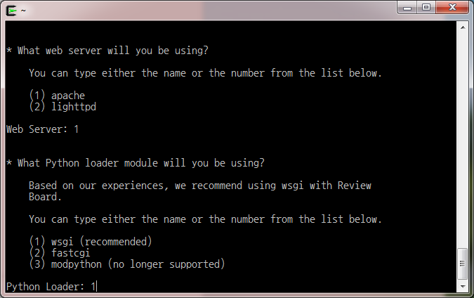 리뷰보드 사전 설치 사항 중 MySQL 설치 과정 마지막에 리뷰보드를 위해 생성했던 데이타베이스 이름을 입력한다.